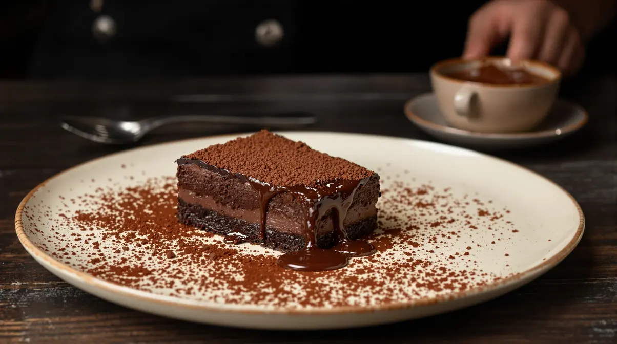 Ce gâteau ne ressemble pas à un cake classique. Il se situe entre la truffe au chocolat géante, le brownie fondant et la ganache prise au four. Chaque bouchée fond sur la langue, sans être écœurante.